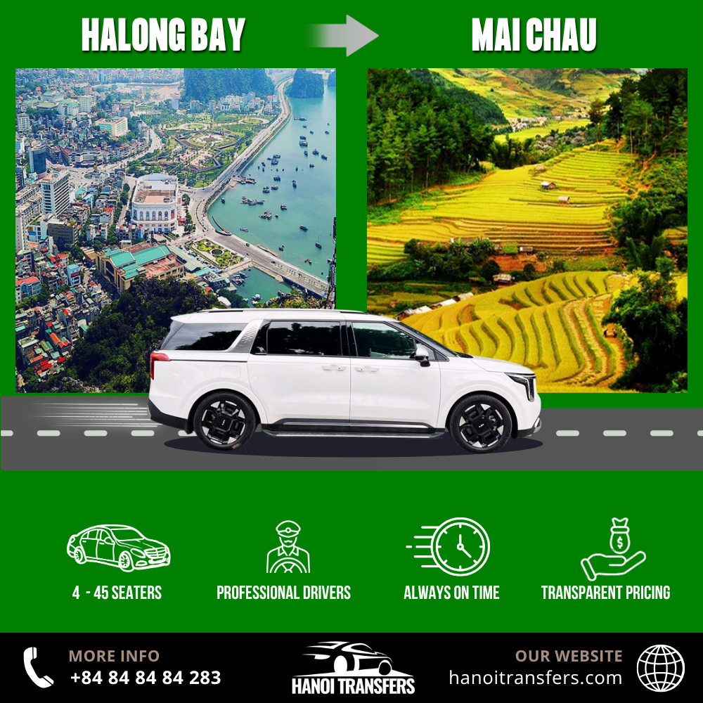 Traveling from Halong Bay to Mai Chau offers one of the most unique journeys in northern Vietnam — from the emerald waters of the Gulf of Tonkin to the peaceful rice valleys surrounded by limestone cliffs. Whether you’re ending a Ha Long cruise or beginning an inland adventure, Hanoi Transfers provides a seamless private car transfer from Halong Bay to Mai Chau, ensuring comfort, safety, and punctuality throughout your trip.